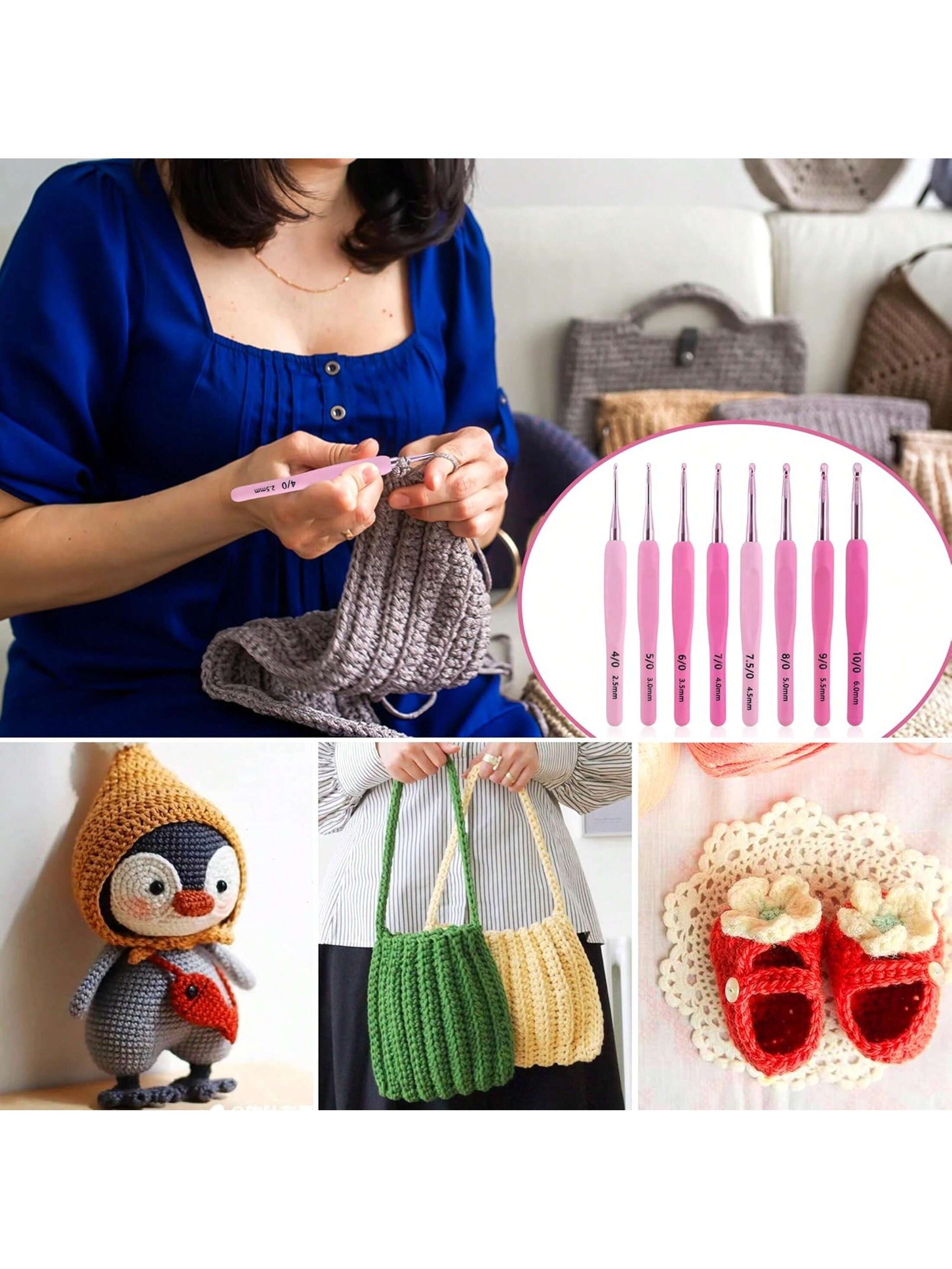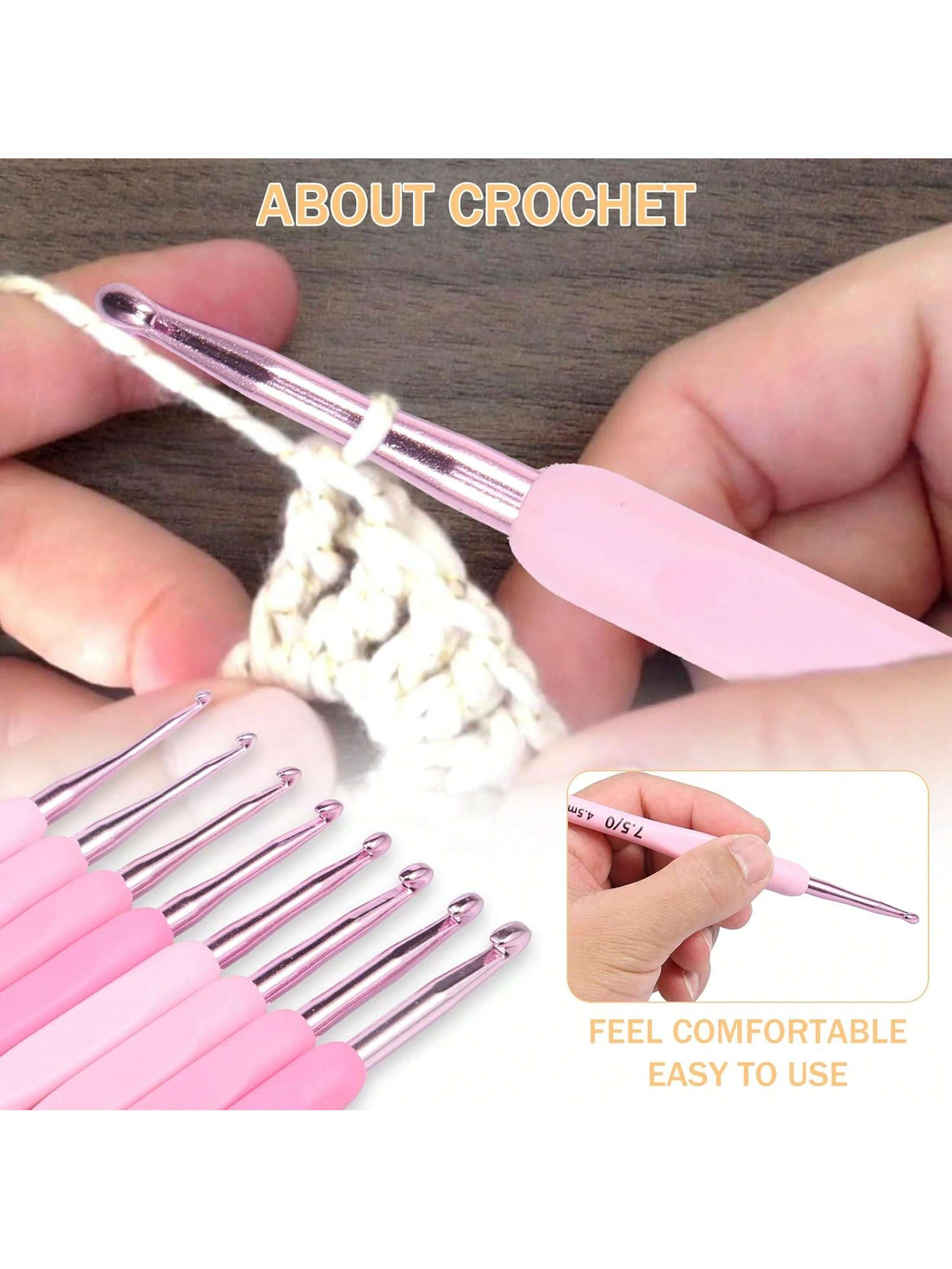 9 قطع - 99 قطعة مجموعة خطاطيف كروشيه ذات مقابض ناعمة باللون الوردي، للغزل والتريكو والكروشيه، مناسبة